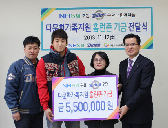 NC 다이노스가 지난 12일 경남 창원시에 위치한 경남다문화가족지원센터를 찾아 ‘NH농협 홈런존’ 운영을 통해 적립된 총 550만원의 적립금을 전달했다고 13일 보도자료를 통해 밝혔다.