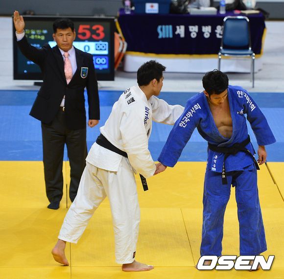 -81kg급 결승전 김재범(한국마사회)과 홍석웅(한국마사회)의 경기, 김재범이 우세승으로 우승을 차지했다. 경기 종료 후 인사를 나누고 있는 김재범과 홍석웅.