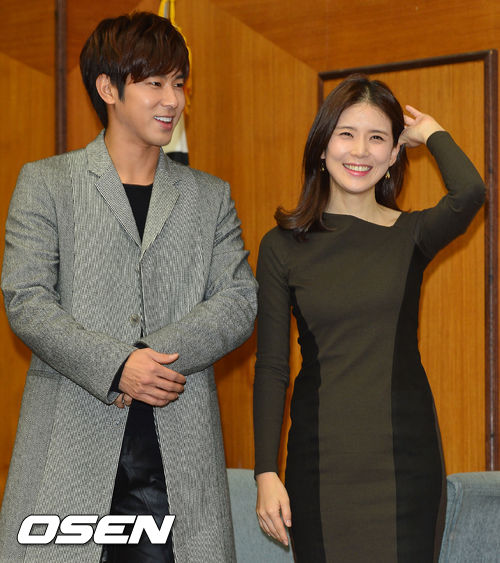 13일 오후 서울 영등포구 여의도 KBS 신관 국제회의실에서 열린 2013 '희망로드 대장정 Road for Hope' 제작발표회서 정윤호와 이보영이 포토타임을 기다리며 미소짓고 있다.