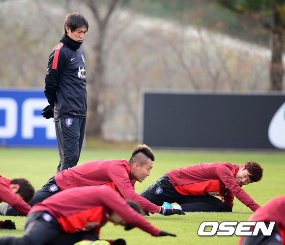 홍명보 감독이 스트레칭중인 김신욱, 손흥민과 이야기를 나누고 있다.