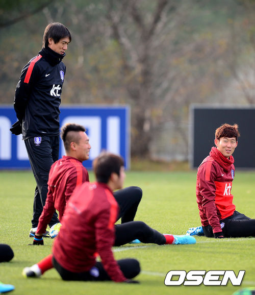 홍명보 감독이 스트레칭중인 김신욱, 손흥민과 이야기를 나누고 있다.
