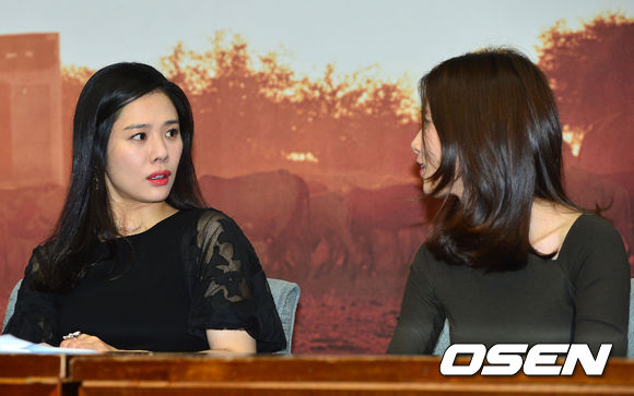 13일 오후 서울 영등포구 여의도 KBS 신관 국제회의실에서 열린 2013 '희망로드 대장정 Road for Hope' 제작발표회서 이보영이 김현주에게 자신의 체험담을 얘기하고 있다.
