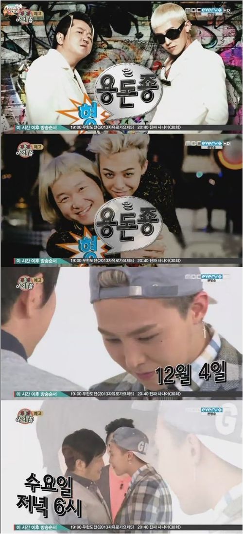 지드래곤이 출연하는 ‘주간아이돌’은 다음 달 4일에 전파를 탈 예정. 공개된 예고 속 지드래곤은 ‘무한도전’ 가요제에서 호흡을 맞춘 정형돈과 얼굴이 밀착돼 있는 등 친분을 과시하고 있다.