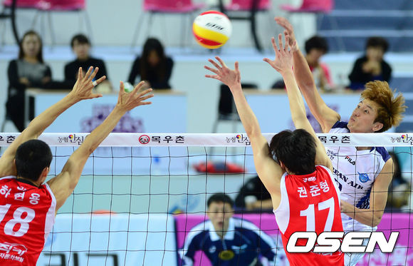 13일 오후 인천계양체육관에서 열린 '2013-2014 NH농협 V리그' 남자부 대한항공과 LIG손해보험의 경기 2세트 곽승석이 공격을 시도하고 있다.