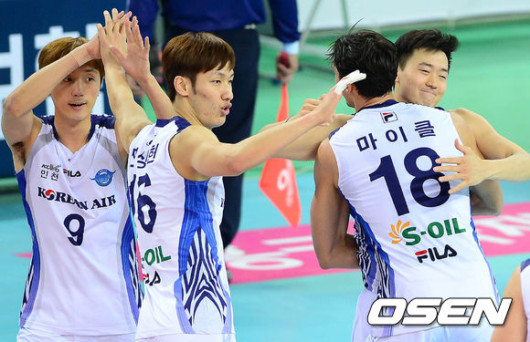 13일 오후 인천계양체육관에서 열린 '2013-2014 NH농협 V리그' 남자부 대한항공과 LIG손해보험의 경기 2세트 종료 후 대한항공 선수들이 포옹을 하며 기뻐하고 있다.