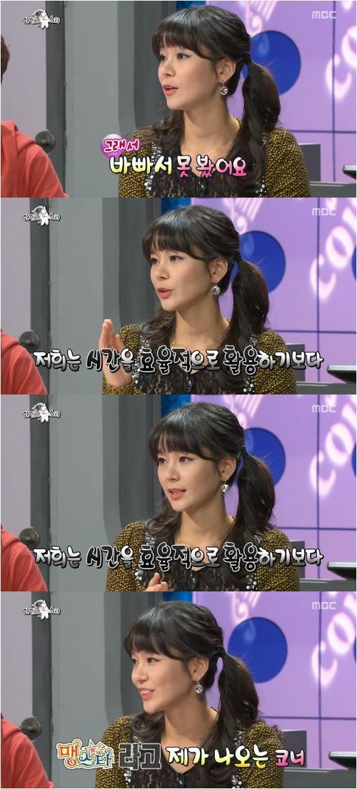 맹승지는 13일 방송된 MBC 예능프로그램 ‘황금어장-라디오스타’에서 이 프로그램을 보지 못한다면서 “우리는 회의를 18시간 한다. 바빠서 못봤다”고 말했다.