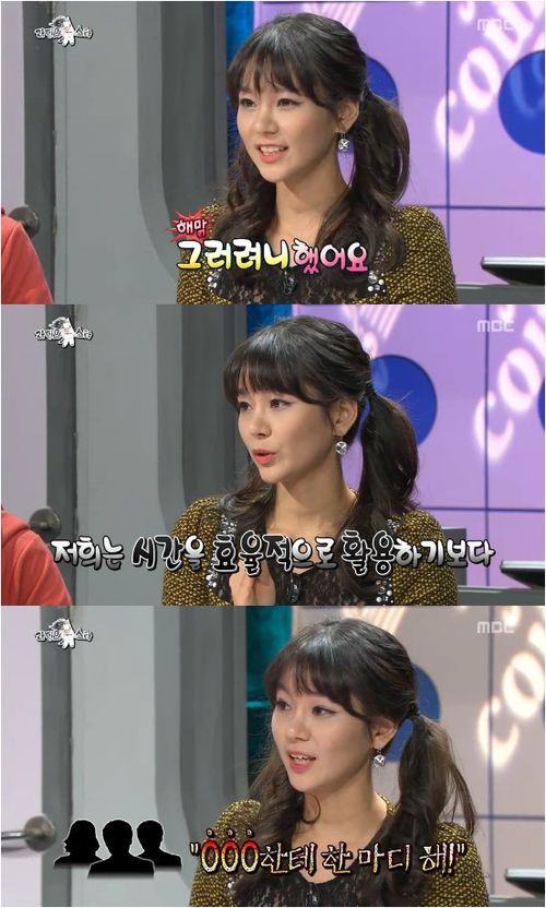 자신의 출연료가 29만 원이라는 이야기 꺼내기 어려운 말도 하고, 비록 방송에는 실명이 공개되지 않았지만 전 남자친구의 이름을 툭툭 쏟아내는 그의 모습은 순수하기도 했고 웃기기도 했다. 아울러 자신이 ‘무한도전’에 자주 출연하면서 김태호 PD와 인연을 갖고 있는 것이 아니냐는 질문에 “출연 전에는 잘 몰랐다. 처음 보고 스타일리스트인 줄 알았다”고 성역 없는 개그를 펼쳤다.