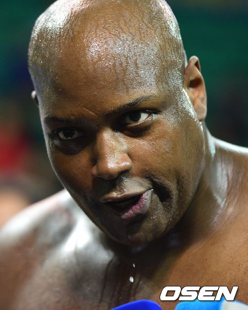 세계특별장사씨름대회에 참가한 커티스 존슨(미국)이 취재진과의 인터뷰 시간을 갖고 있다.