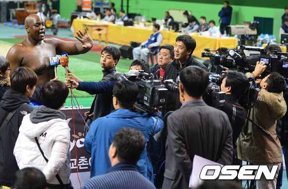 세계특별장사씨름대회에 참가한 커티스 존슨(미국)이 취재진과 인터뷰 시간을 갖고 있다.