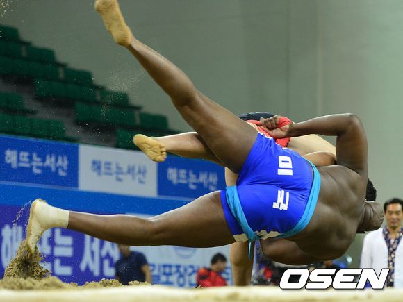 천하장사결정전에 참가한 커티스 존슨(미국)과 장수남(인천일반)의 경기, 장수남 선수가 안다리로 두 번째 판 승리를 거두고 있다.