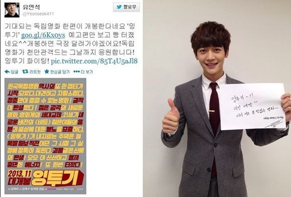 유연석은 13일 자신의 트위터를 통해 “예고편만 보고 빵 터졌네요^^ 개봉하면 극장 달려가야겠어요! 독립 영화가 천만 관객 드는 그 날까지 응원합니다! 잉투기 화이팅!” 이라며 '잉투기'를 응원하는 글을 올리며 한국영화 사랑도 드러냈다.