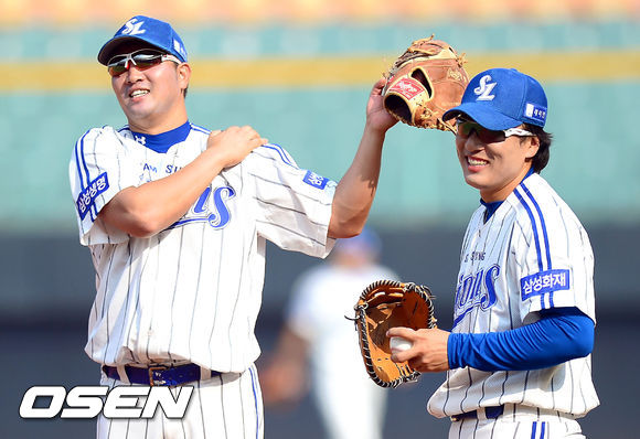 삼성 이승엽과 채태인이 훈련을 하며 미소를 짓고 있다.