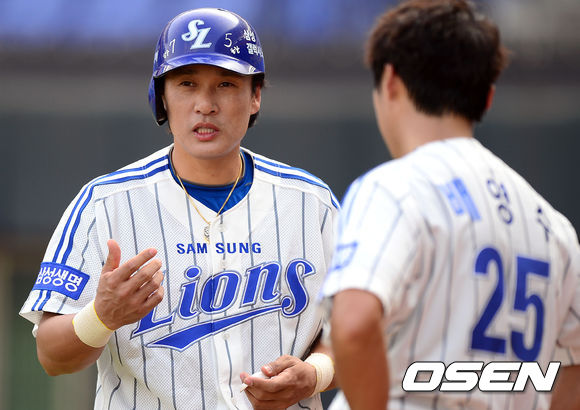 삼성 이승엽과 배영수가 이야기를 나누고 있다.