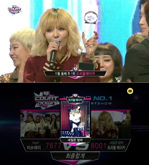 트러블메이커는 14일 방송된 '엠카운트다운'에서 '내일은 없어'로 지난주에 이어 2주 연속 1위 트로피를 손에 넣었다.