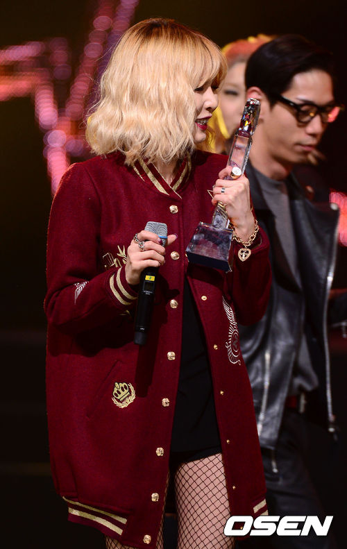 14일 오후 서울 상암동 CJ E&M에서 열린 Mnet '엠카운트다운(이하 엠카) 생방송 무대에서 엠카 1위를 수상한 트러블 메이커 현아가 트로피에 키스를 하고 있다