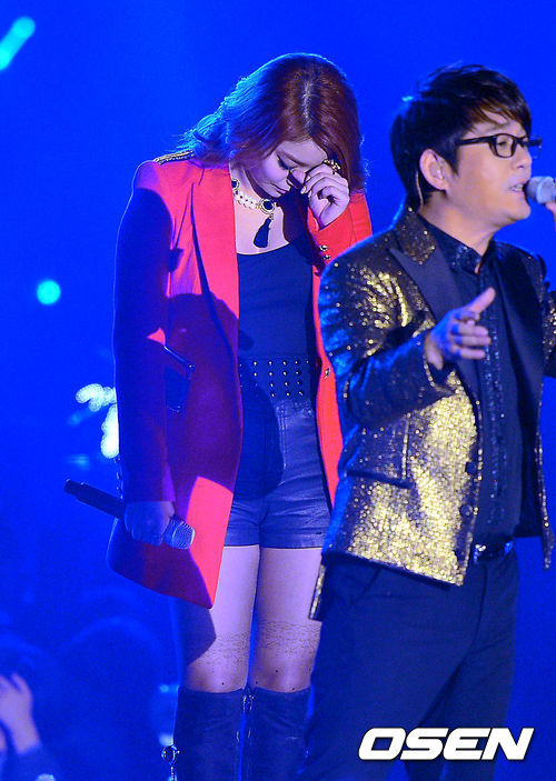 가수 에일리가 무대위에서 고개를 숙이고 있다.