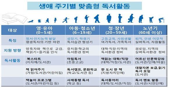 문체부는 오는 2018년까지 성인 독서율 80%를 목표로, 독서진흥위원회 설치, 1학교 1동아리 운영, 독서경영 지원, 영•유아기부터 노년기까지 독서활동 지원, 10만 동아리 결성, 도서구입비 세제 지원 추진 등의 내용을 담은 '독서문화 진흥기본계획(2014∼2018년)'을 발표했다.
