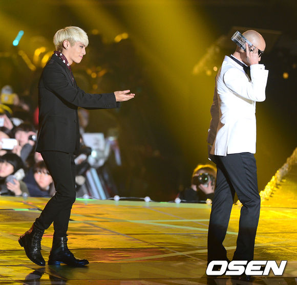 시상자 홍석천이 탑10을 수상한 샤이니 종현에게 장난을 치고 있다.