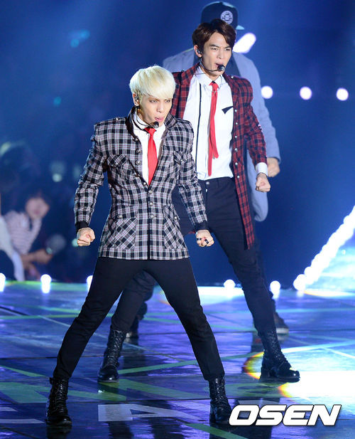 그룹 샤이니 종현과 민호가 화려한 공연을 펼치고 있다.