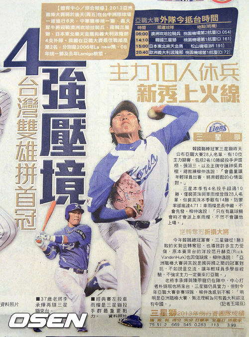 삼성 라이온즈 투수 차우찬과 내야수 이승엽이 대만 언론의 관심을 한 몸에 받고 있다. 2013 아시아 시리즈 우승 후보로 꼽히는 삼성의 투타 핵심이기 때문.