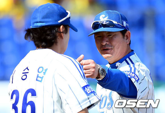 삼성 류중일 감독이 이승엽과 인사를 나누고 있다.