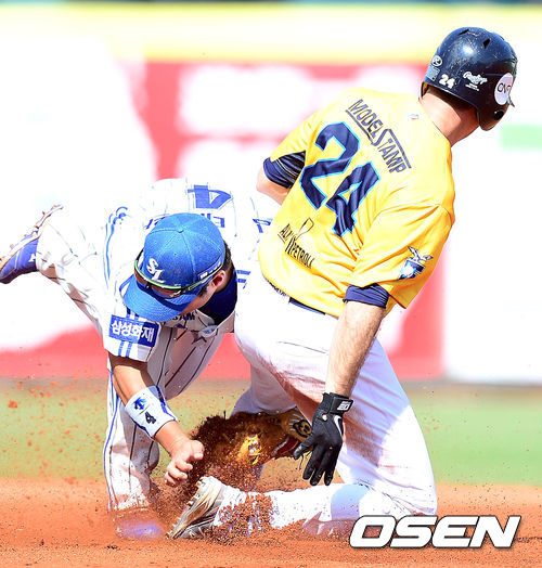 2회초 무사 1루 삼성 김태완이 안타 때린 뒤 2루까지 진루하던 리베르지아니를 잡아내고 있다.