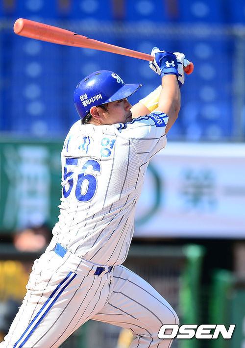 2회말 1사 2,3루 삼성 이지영이 우익수 희생플라이로 타점을 올리고 있다.