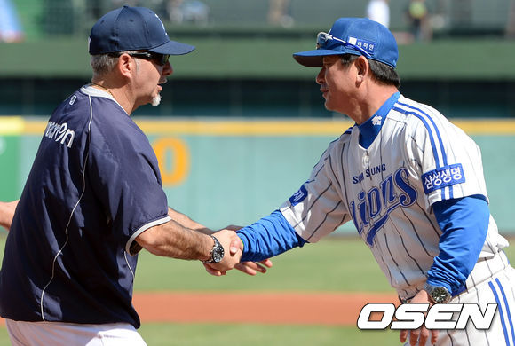 삼성 류중일 감독과 볼로냐 마르코 난니 감독이 인사를 나누고 있다.