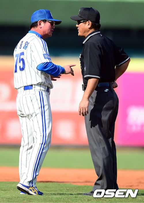 6회말 1사 2루 삼성 류중일 감독이 2루주자 박석민의 리터치아웃 판정에 어필하고 있다.