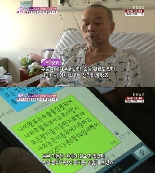담도암 투병 중에도 이왕표씨는 15일 방송된 KBS 2TV '여유만만'에서 "수술 중 내가 혹시 잘못된다면 눈은 이동우 씨에게 줬으면 좋겠다"는 유서를 공개했다.