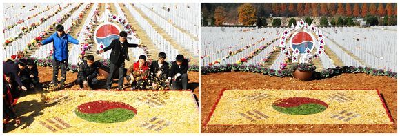 화제의 대형 낙엽 태극기는 국립대전현충원(원장 민병원)에 등장한 것이다. 국립대전현충원은 지난 13일, 원내 곳곳에 떨어진 다양한 색상의 가을 낙엽을 활용하여 제작한 대형 낙엽 태극기 포토존을 공개했다.