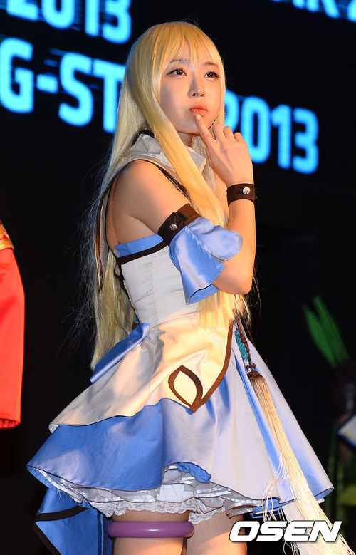 15일 부산 해운대 벡스코(BEXCO)에서 열린 국제게임전시회 '지스타 2013'에서 DOTA2 코스프레 모델 민다흰이 포토타임을 갖고 있다.