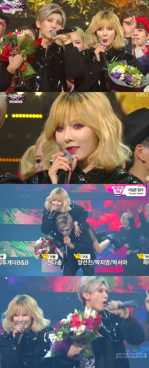 트러블메이커는 15일 방송된 KBS 2TV '뮤직뱅크'에서 샤이니를 누르고 1위를 차지한 후 소속사와 가족, 지인들에게 감사 인사를 건넸다.