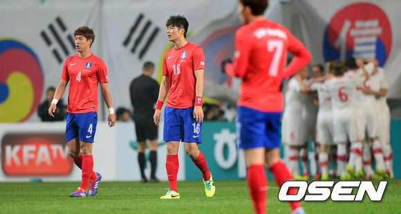 전반 스위스 퍄팀 카사미에게 선제골을 허용한 한국 선수들이 아쉬운 표정을 짓고 있다.