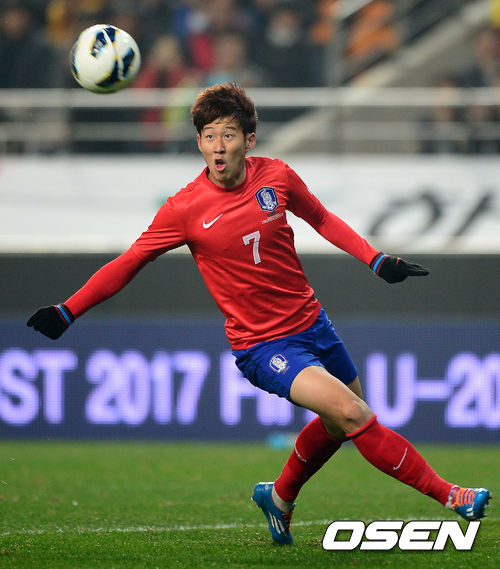 전반 한국 손흥민이 발리슛을 시도하고 있다.