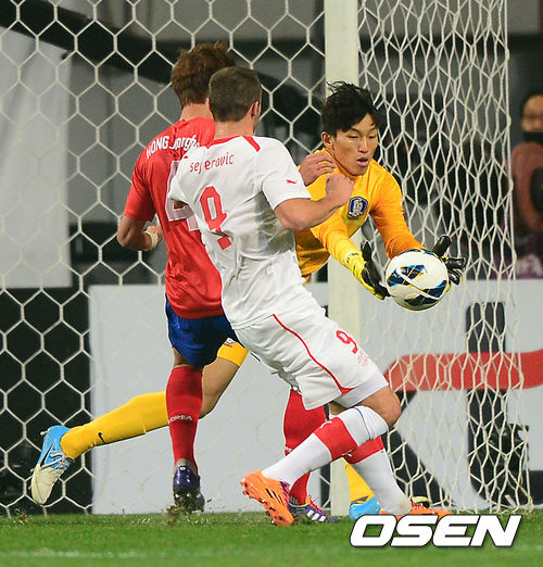전반 한국 김승규가 스위스 세페로비치의 슛을 막아내고 있다.