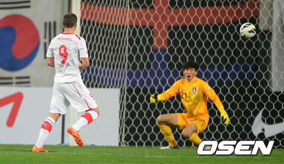 전반 한국 김승규가 스위스 세페로비치의 슛을 막아내고 있다.
