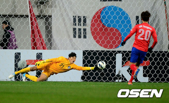 전반 한국 김승규가 스위스 퍄팀 카사미에 선제골을 허용하고 있다.