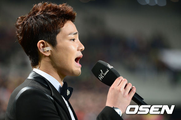 경기에 앞서 가수 구자명이 애국가를 부르고 있다.