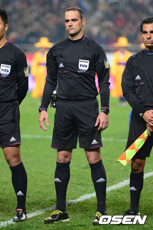 경기에 앞서 아르헨티나 출신 주심 디에로 아발이 식전 행사를 갖고 있다.