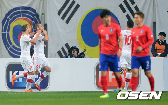 홍명보 감독이 지휘하는 한국 축구대표팀은 15일 서울월드컵경기장서 스위스와 평가전서 전반 7분 선제골을 내줬다. 한국은 반격을 펼쳐 전반 14분 프리킥 상황에서 김신욱이 헤딩으로 스위스의 골망을 흔들었지만, 오프사이드가 선언돼 득점으로 인정되지 않았다.
