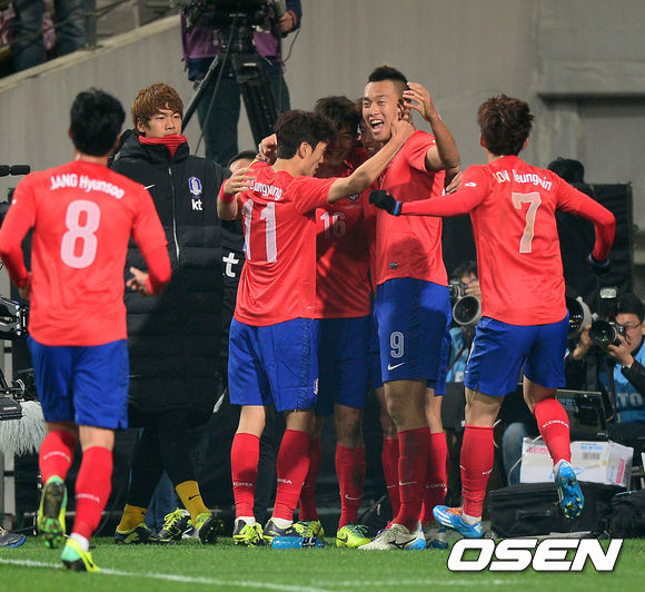 후반 동점골을 성공시킨 한국 홍정호가 동료들과 환호하고 있다.