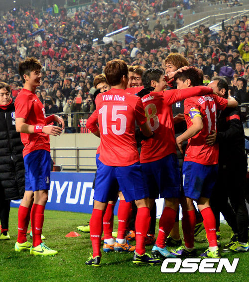 후반 한국 이청용이 역전 헤딩슛을 성공시키고 동료선수들과 기뻐하고 있다./jpnews@osen.co.kr