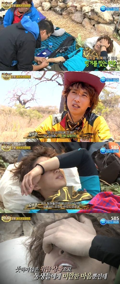 8일 오후 방송된 SBS 예능프로그램 '정글의 법칙 in 사바나'(이하 '정글의 법칙')에서는 김원준의 몸상태가 급격히 나빠지는 모습이 그려졌다.
