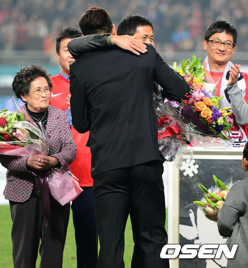하프타임 때 한국 이영표가 은퇴식에서 설기현과 포옹을 하고 있다./sunday@osen.co.kr