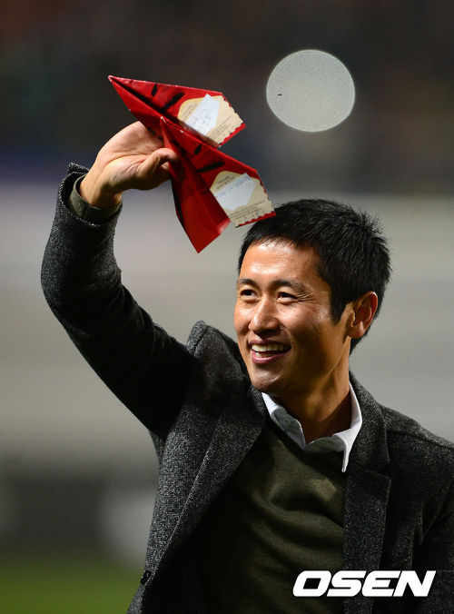 하프타임에 이영표가 은퇴식을 하며 팬들에 인사를 하고 있다./jpnews@osen.co.kr