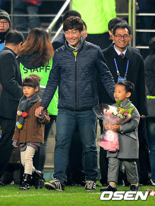 하프타임 송종국이 딸 지아양과 아들 지욱군과 함께 이영표 은퇴식에 참석하고 있다./jpnews@osen.co.kr
