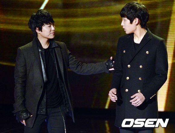 박재정이 15일 밤 서울 잠실실내체육관에서 열린 케이블채널 엠넷 오디션 프로그램 '슈퍼스타K 5' 결승전에서 우승을 차지한 뒤 박시환의 축하를 받고 있다.
