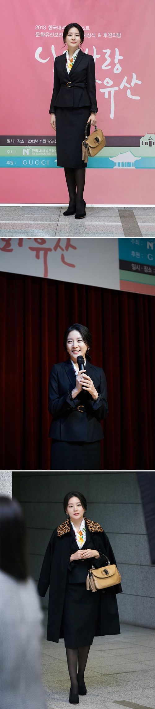 이날 이영애는 구찌 블랙 스커트 정장에 화사한 플로럴 프린트의 스카프와 은은한 골드 컬러의 뱀부 백으로 포인트를 준, 단아하면서도 우아함이 빛나는 스타일을 선보였다.