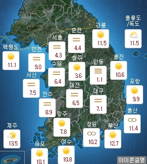 밤부터 북서쪽에서 찬공기가 내려와 강원도와 경북 지방에는 눈이 내리는 곳도 잇다. 아침 기온은 서울 4도 등 전국이 영하 2도에서 영상 8도로 어제보다 조금 낮다. 낮 기온은 서울 14도, 전주·대구 16도로 어제와 비슷해 완연한 늦가을 날씨를 보인다.